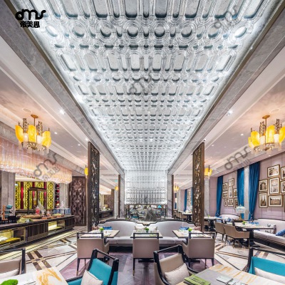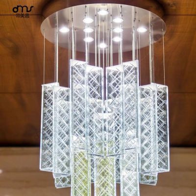 長方形格子形狀玻璃吸頂?shù)鯚舸笮途频瓴蛷d會所售樓處空中吊飾